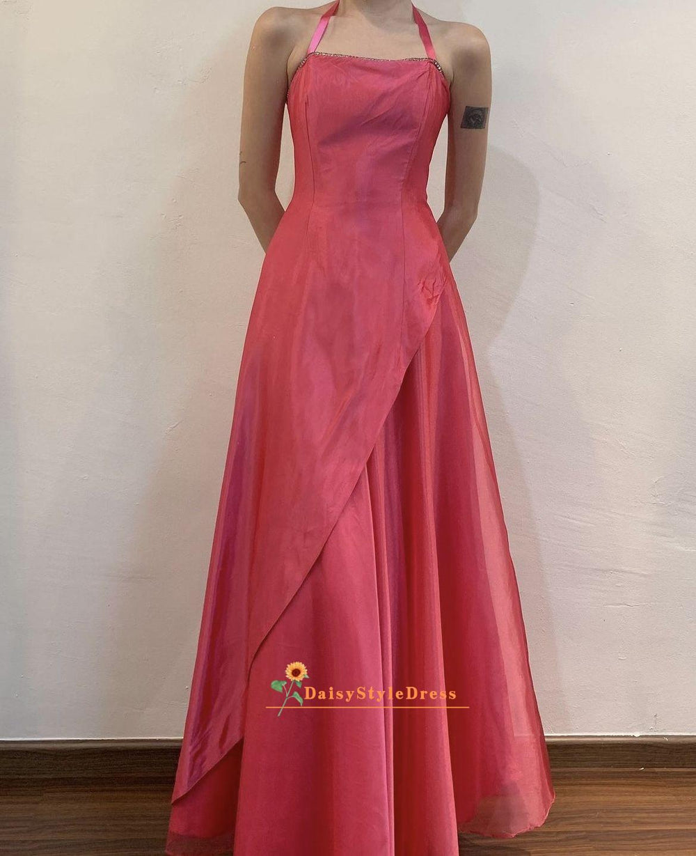 Full Length Halter Neck Deep Pink Vintage Prom Dress