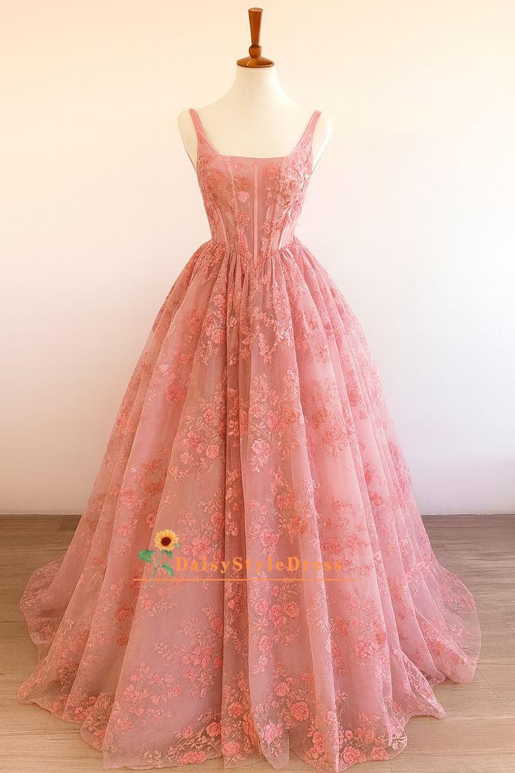 Ball Gown Square Neckline Pink Floral Lace Prom Dress