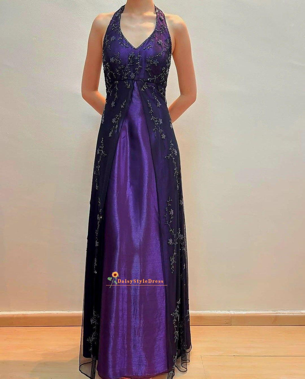 Purple Halter Prom Dress, A-Line Beaded Vintage Evening Gown