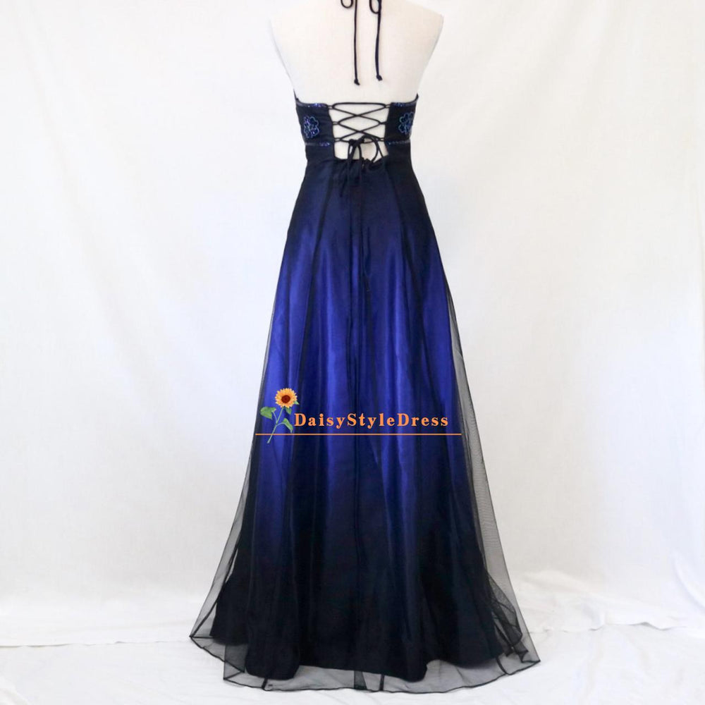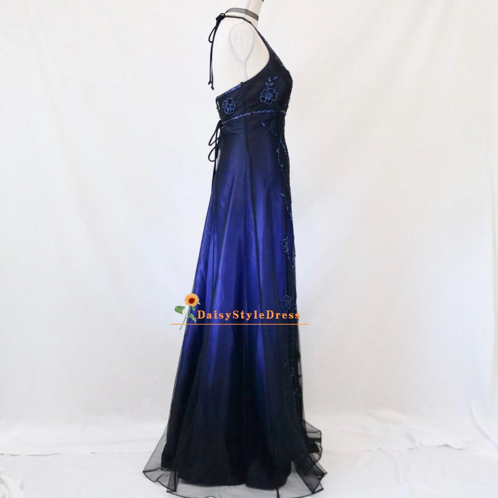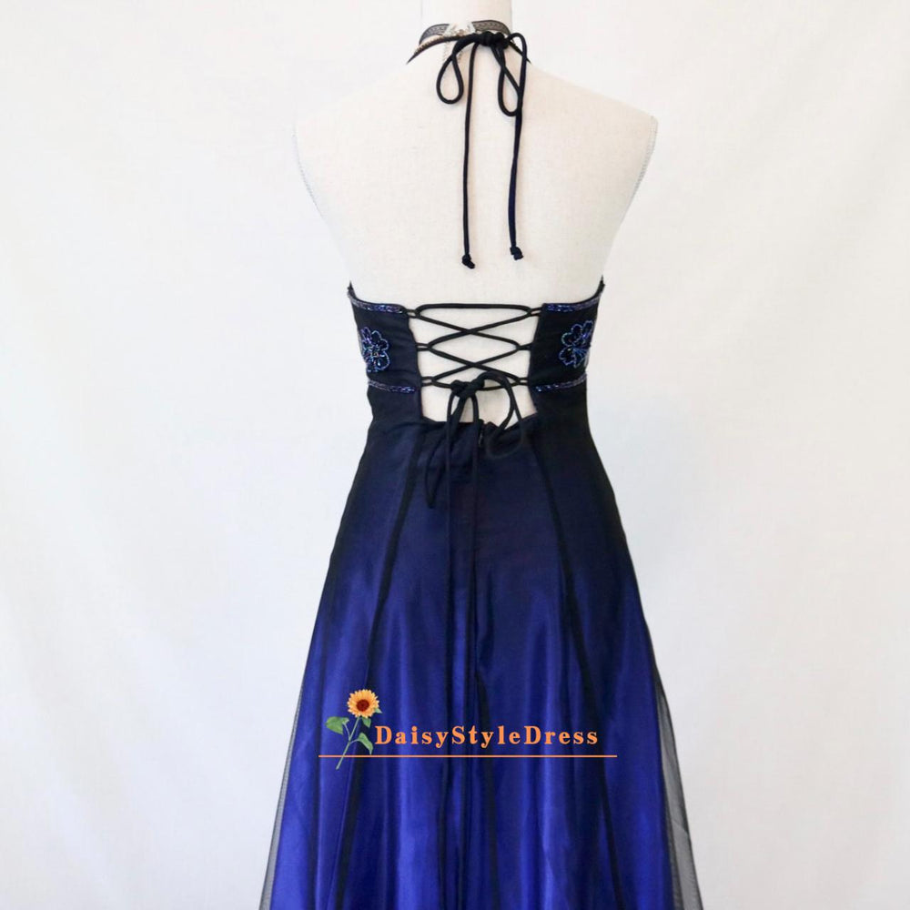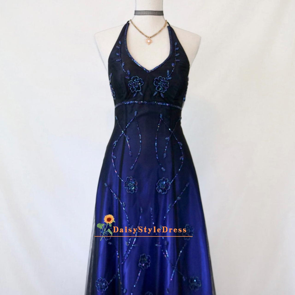 Vintage Navy Blue Halter Prom Dress,90s Beaded Maxi Evening Gown