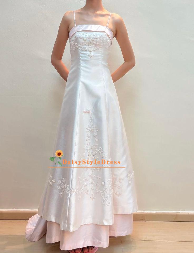 Vintage Pink Prom Dress-90s Embroidered Spaghetti Strap A-Line Gown