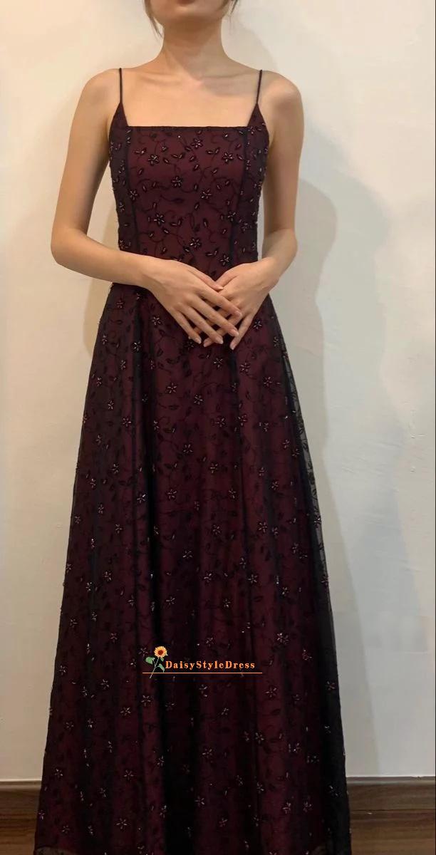 Vintage Square Neckline Burgundy Lace Evening Gown